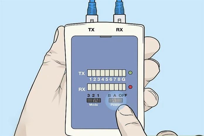 3. سر دیگر کابل را به جک گیرنده یا همان بخش RX وصل کنید. در صورتی که ورودیهای TX و RX هر دو بر روی یک دستگاه قرار دارد هر دو سر کابل را به همان دستگاه وصل کنید. اما اگر تستر در دو بخش مجزا طراحی شده، هر یک از سرهای کابل را به یکی از دستگاهها متصل نمایید. (معمولاً قطعات مجزای تستر به خاطر کشیدن کابل به اتاق دیگر است تا فرایند اتصال کابل را در مسافتهای مختلف مورد بررسی قرار دهد.)